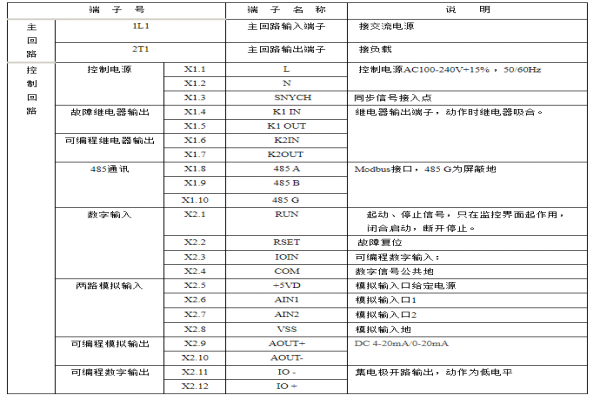 了解詳情 +CMC-L系列數(shù)碼型軟起動(dòng)器有12個(gè)外引控制端子,為用戶實(shí)現(xiàn)外部信號(hào)控制、遠(yuǎn)程控制及系統(tǒng)控制提供方便。端子號(hào)端子名稱說明主回路1L1、3L2、5L3交流電源輸入端子接三相交流電源2...